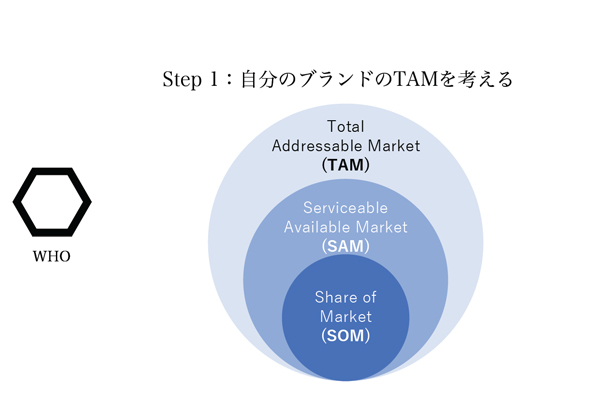 まずステップ1は、「TAM」「SAM」「SOM」の概念を用いる。TAMとは、Total Addressable Marketの略で、事業の最終的な規模を意味する。そのうち、メインカテゴリー全体がSAM(Serviceable Available Market)で、自社のシェアがSOM(Share Of Market)だ。たとえば、プロテインブランドだったら、プロテインカテゴリー全体がSAMで、自社のシェアがSOMになる。