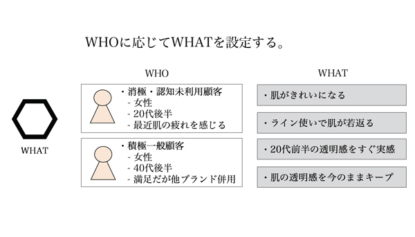その上で、WHATはWHOに合わせて設定していく。架空のスキンケアブランドを例に、考えてみよう。