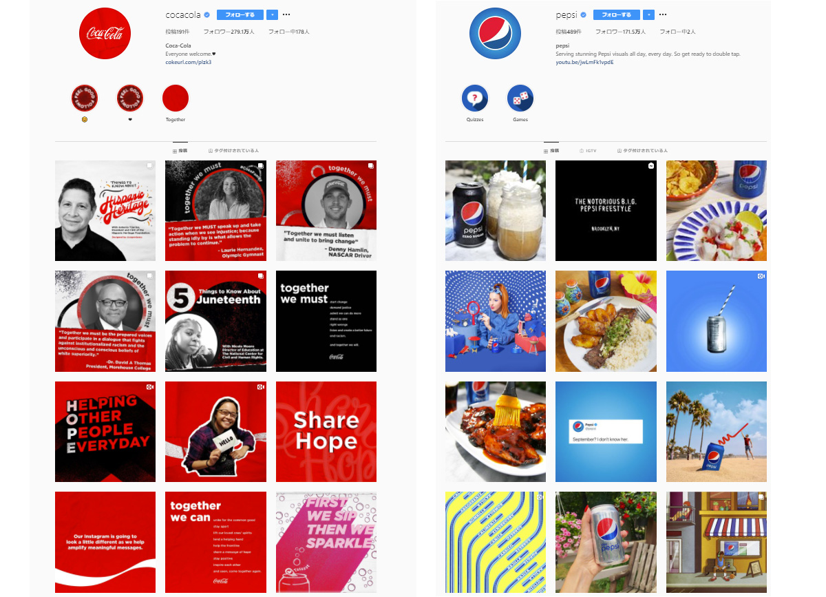 その違いは、両者のInstagramアカウントを見ると一目瞭然です。コカ・コーラが商品をほとんど出さず、人の写真やメッセージを前面に出しているのに対し、ペプシコーラは商品の写真が目立ちます。
