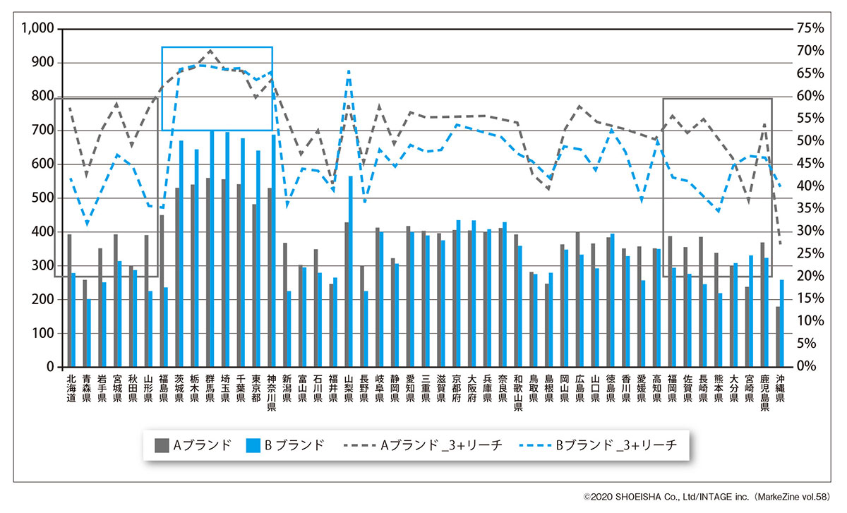 図表3 2ブランドの各エリア別GRPおよびリーチ率(タップで画像拡大)
