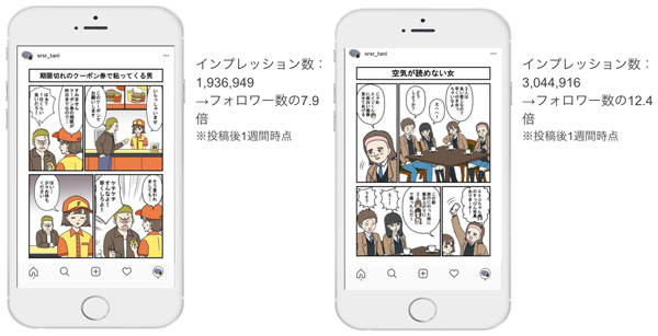 こうした地道な運営によって、発見タブへの掲載などから認知されていないユーザーに届けること、既存のフォロワーに楽しんでいただき続けることを実現しました。Instagramで連載を開始した当初、フォロワーは1,000人程でしたが、その後週に5,000~10,000人のペースで増えています。
