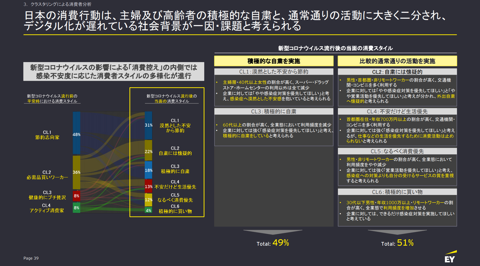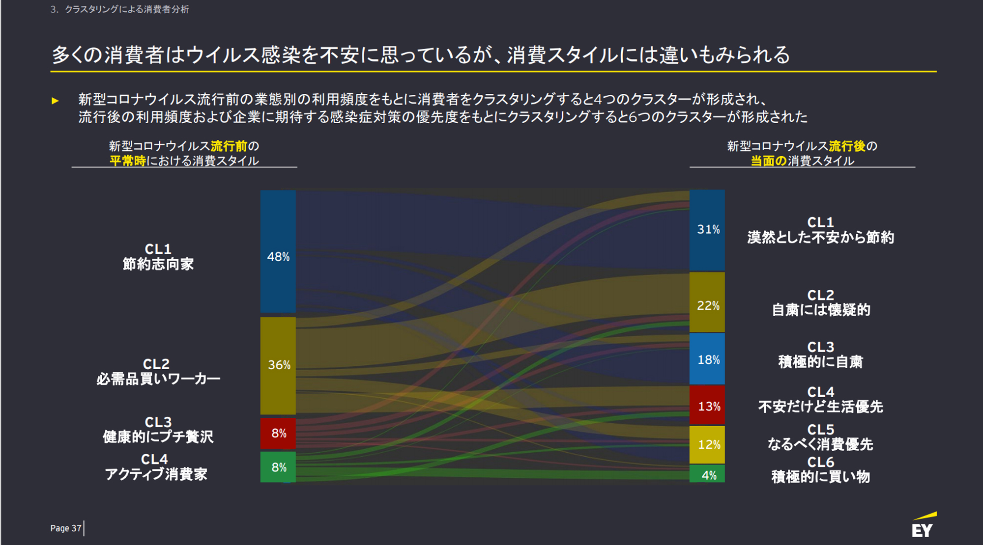 流行後の消費スタイル(6つのクラスター)は以下に分類できる(下図の右側の表を参照)。