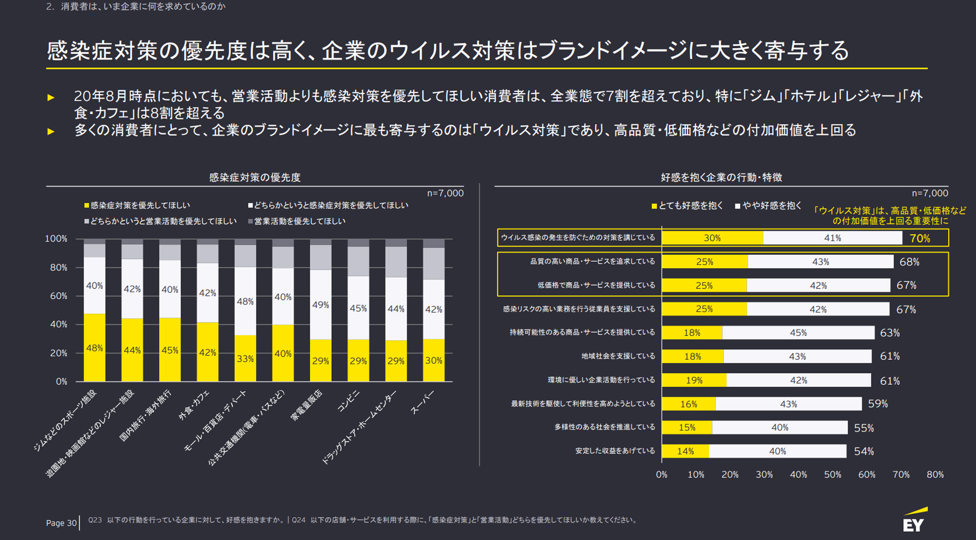 ニューノーマルにおいて、消費者が企業に期待するアクションは変わったのだろうか。調査では、「次の行動をとっている企業に対して、好感を抱きますか」という質問とともに様々な企業のアクションを提示したところ、ウイルス対策が、高品質・低価格などの付加価値を上回る結果となった(グラフ右側)。