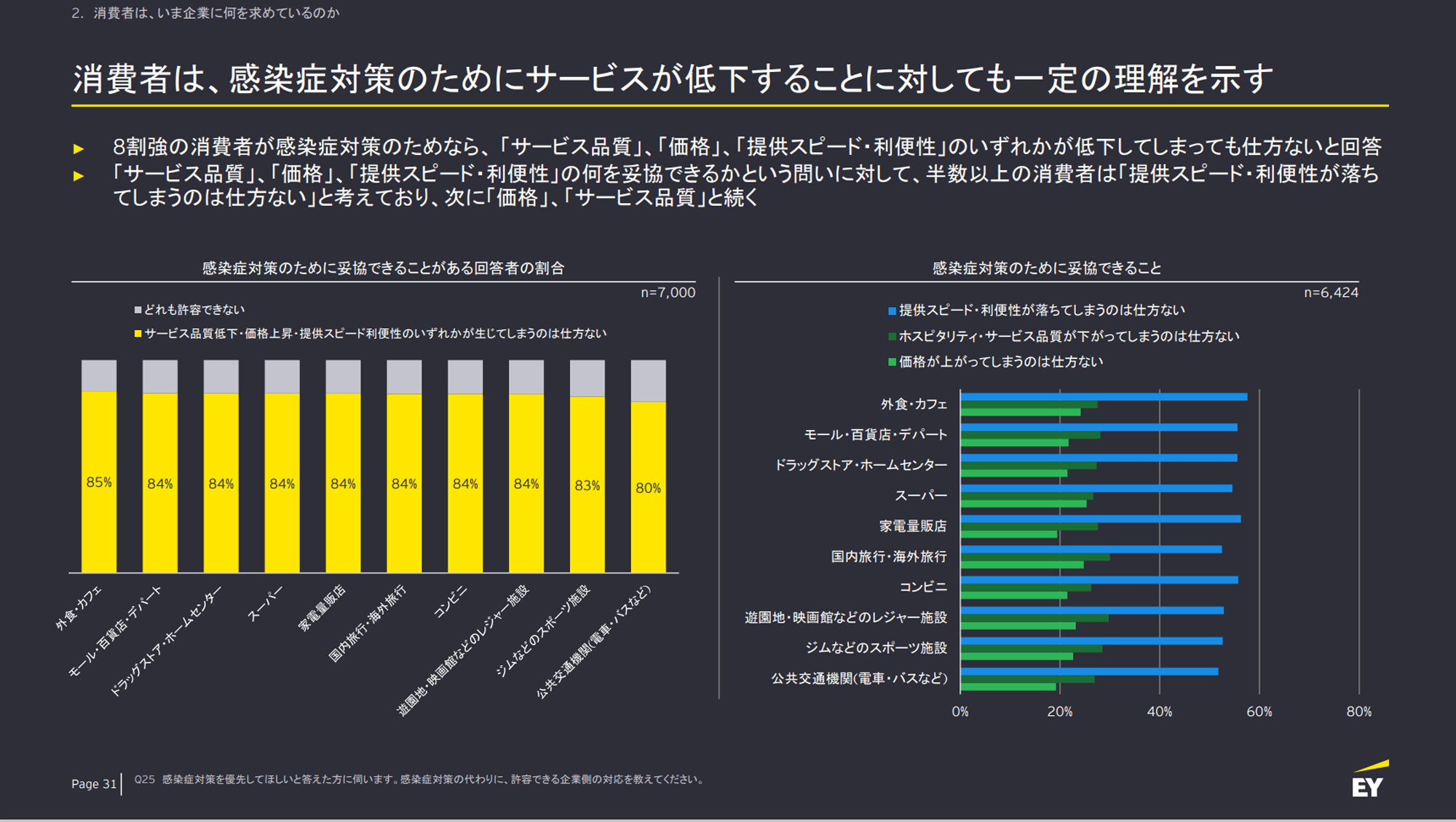 また「感染症対策のためにサービスが低下すること」に理解を示す回答が8割を占めた。「サービス品質」「価格」「提供スピード・利便性」のどの要素を妥協できるかという問いに対しては、半数以上の消費者は「提供スピード・利便性」を挙げた。