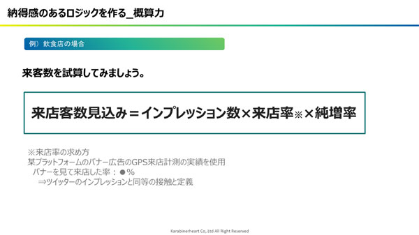 吉田:概算でいいから納得感のあるロジックを作ってみよう、ということです。これは飲食店でのSNSの来店効果を計るロジックで、次のような式で運用しました。