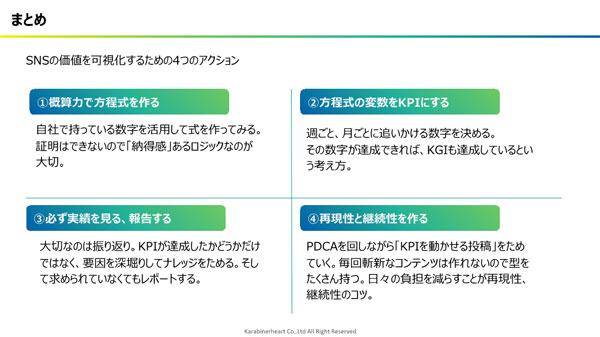 もしも、コロナ前からこういうふうに数字を用いていれば、コロナの時も「これは続けて大丈夫」となったものもあるかもしれません。やはり常に回りや経営層を納得させられる材料は必要なので、ぜひ、みなさんも今回の効果測定方法を参考にして自社の式を作り、KPIを作っていって欲しいと思います。