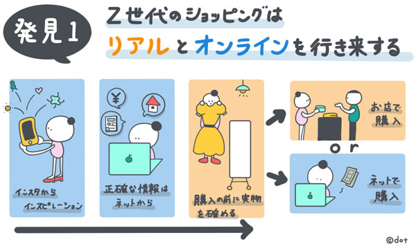 【発見1】Z世代のショッピングはリアルとオンラインを行き来する。Instagramでインスピレーションを受けて、正確な情報が知りたければネットで検索。購入するときはお店で実物を確かめてから、そのまま買うorネットで買う。