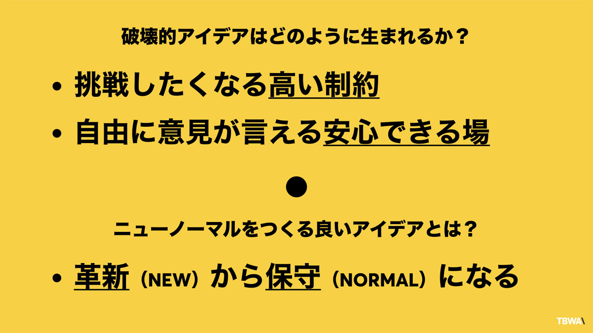では、「新しいことをやってみよう」と思う人が誰しも破壊的なアイデアを生み出すことができるかというと、それだけでは足りません。そこには、皆がネガティブに感じている社会的かつ外的な制約を、「自らが乗り越えるもの」とポジティブに自分ごと化した内的制約に捉え直すことが必要で、この変換を促すものこそお二人が大事にされていた信頼関係を生む「場の心理的安全性」なのだと思いました。このストレスのかかる今こそ、破壊的なアイデアを生み出すために安心できる場の確保が必要だと考えられます。