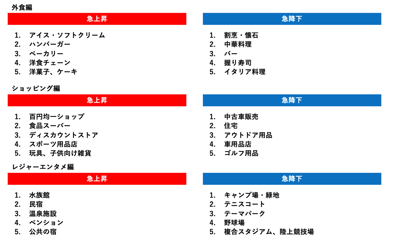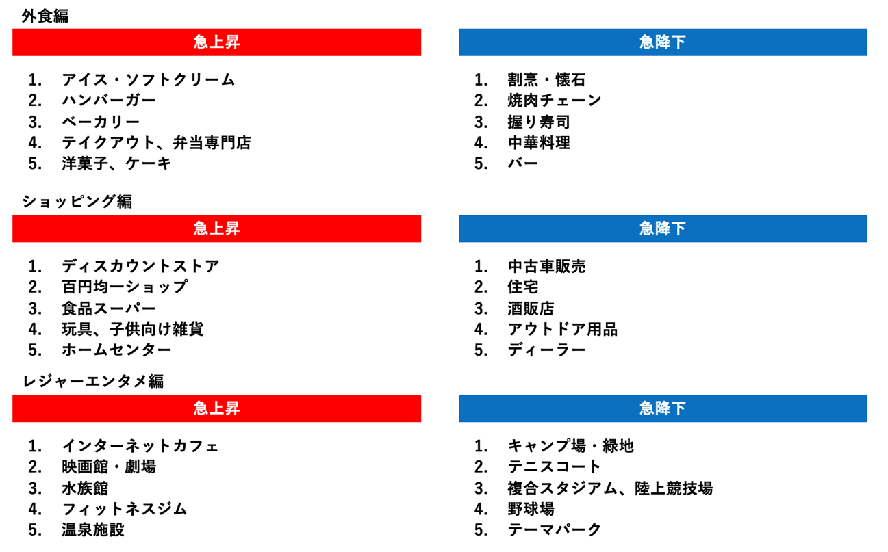 レジャー・エンタメでは民宿や温泉施設、ペンションが急上昇。都心(密)を離れ、比較的安価な値段でゆったり過ごせたりするレジャーが人気のようです。一方で、テーマパークや野球場、スタジアムなど、これまでアクティブな若者がこぞって足を運ぶような場所は、入場制限が実施されていることもあり、まだまだハードルが高いと言えます。
