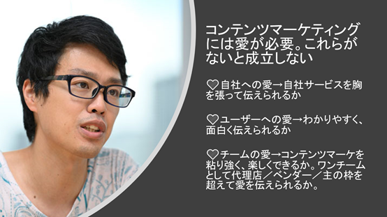 最後はチームの愛で、これは社内だけではなく社外のパートナーを含めて、ワンチームとしてやっていくということです。NDAを結んだのに、なぜか情報公開をしない事業主は多いです。契約を結んだということは「このチームでやっていくぞ」という覚悟なので、ワンチームとして情報公開を惜しみなくすること。この3つの愛が揃わないと、コンテンツマーケティングはうまくいかないんじゃないかと思います。