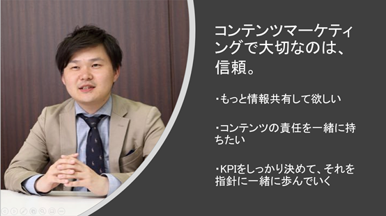 赤司:私はベンダー側として、先ほど福田さんもおっしゃった3つ目の愛でもある、ワンチームとしての信頼関係が重要と思っています。信頼関係が成り立てば、ベンダーはコミットしやすくなり、責任を持ちやすくなります。「その施策はやめといたほうがいい」とか厳しいことも、ベンダーはプロとしてアドバイスしやすくなるし、事業主企業と同じ目線にも立てます。コンテンツマーケティングをやる上では、コンテンツ制作会社さん然り、ツールベンダーさん然り、ワンチームで成功に持っていくための信頼関係が一番重要だと思います。