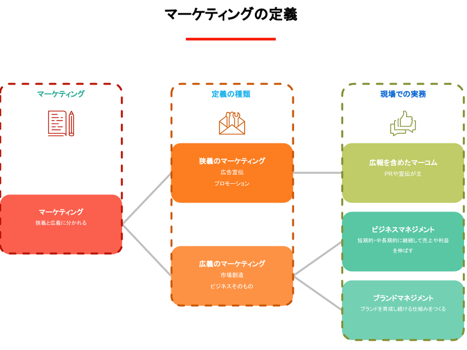 マーケティングの本質について論じる前に、マーケティングの定義を整理しておきたい。筆者はマーケティングには、大きく分けて2つの定義があると考えている。一つは狭義の広告宣伝で、マーケティング&コミュニケーションズ、マーコムと呼ばれることもあるが、単に“マーケティング”と呼ばれている場合もある。