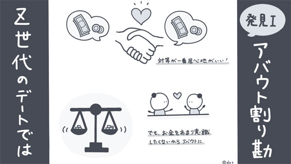 【発見1】Z世代のデートではアバウト割り勘が基本。男女問わず割り勘にしたい理由は、対等な関係でいられることが一番居心地良いから。一方で、アバウトに割っているのはデート中にあまりお金を意識したくないため。