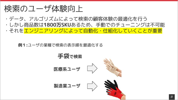 たとえば、「手袋」と検索すると、検索ユーザーの過去の行動履歴に合わせて、表示が変化する。医療系のユーザーの場合は医療現場で使われる手袋が、自動車整備業のユーザーの場合は専用の手袋が表示される。また、商品ページにない専門ワードや業界用語での検索にも対応しているという。ユーザーが少しでも早く目的の商品にたどり着くための仕組みが随所に施されているわけだ。
