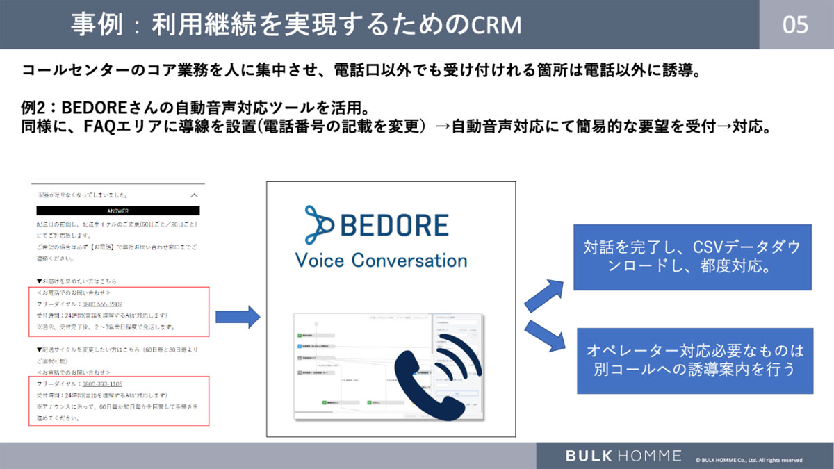 高橋:次に、電話の自動対応をはじめました。使用したのはBEDORE(ベドア)というものです。これまで、電話番号宛ての問い合わせはすべてコールセンターにかかっていましたが、配送に関する電話問い合わせ等の窓口を変更し、住所や配送日時などの変更は自動対応が可能になりました。