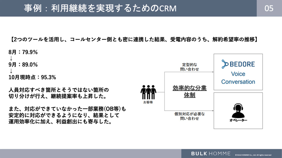 これら2つを掛け合わせて、プラスよかったのは、コールセンターへの解約希望者の電話の割合が、7月は80%だったのが10月は95%まで上がってきたことです。こちら側からのアクションが必要な業務にコールセンターで集中できたため、継続率も上がるという結果になりました
