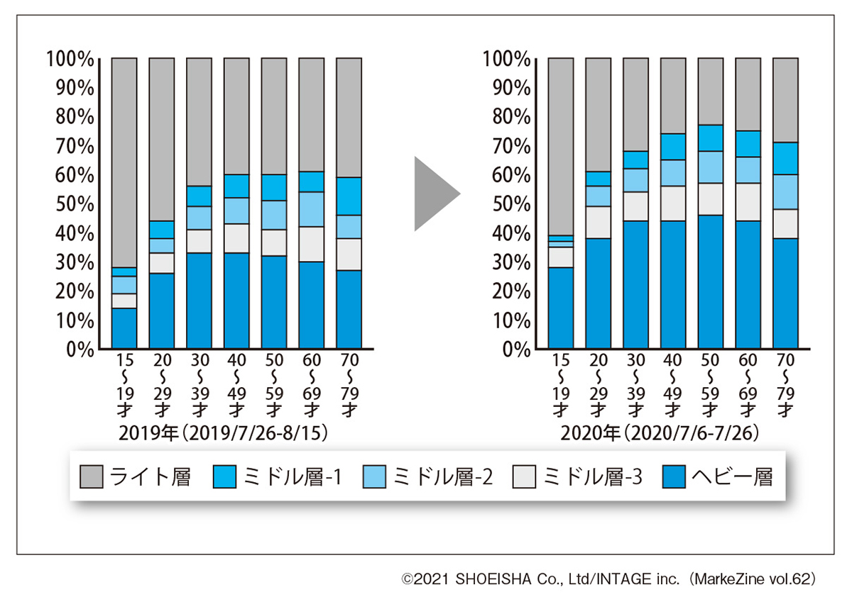ライト層に着目すると、どの年代についても2019年から2020年にかけて構成比が減っております。一方で、ヘビー層に着目すると、2019年は30~40代がピークだったのに対して、2020年は50代にピークが移っております。