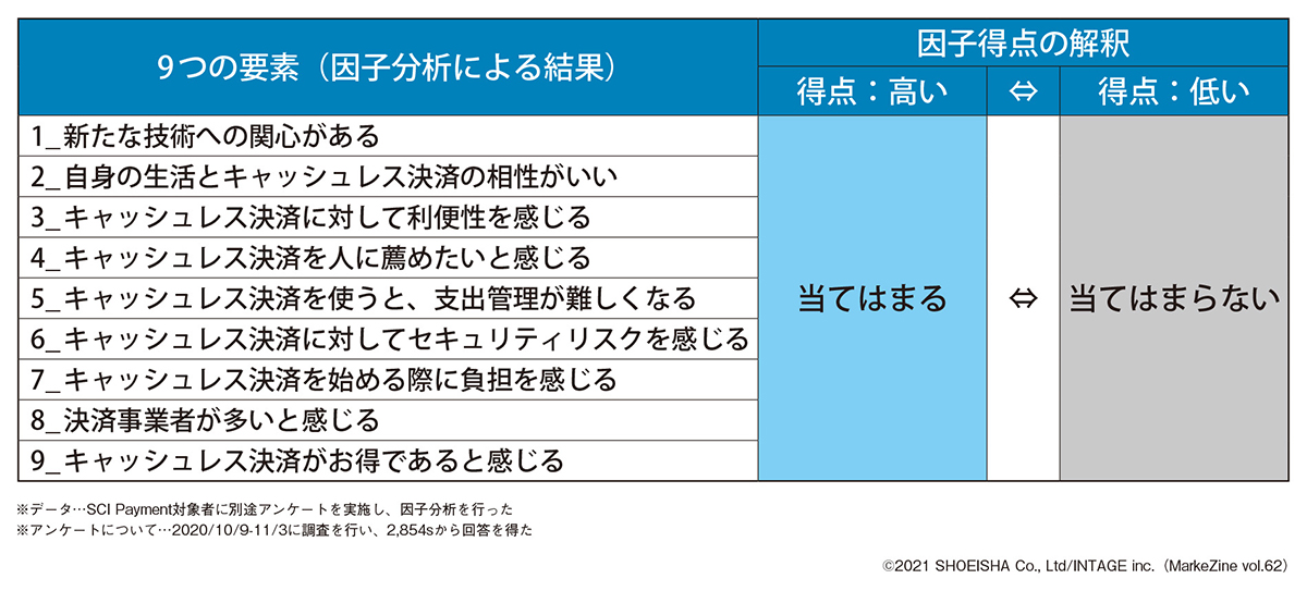 ここまでは時系列の浸透度、決済行動とデモグラフィック属性の関係を見てきましたが、ここからは決済行動と意識の関係性を見ていきます。日本政府や決済事業者の視点になってみると、今後もキャッシュレス比率を上げ続けるためには、キャッシュレス決済が使える場面を増やすことや、キャッシュレス決済を使う際の心理的なボトルネックを特定する必要があります。SCI Payment対象者に対して行った意識調査を因子分析した結果、キャッシュレス決済を巡る意識が9つの要素に集約されました(図表4)。