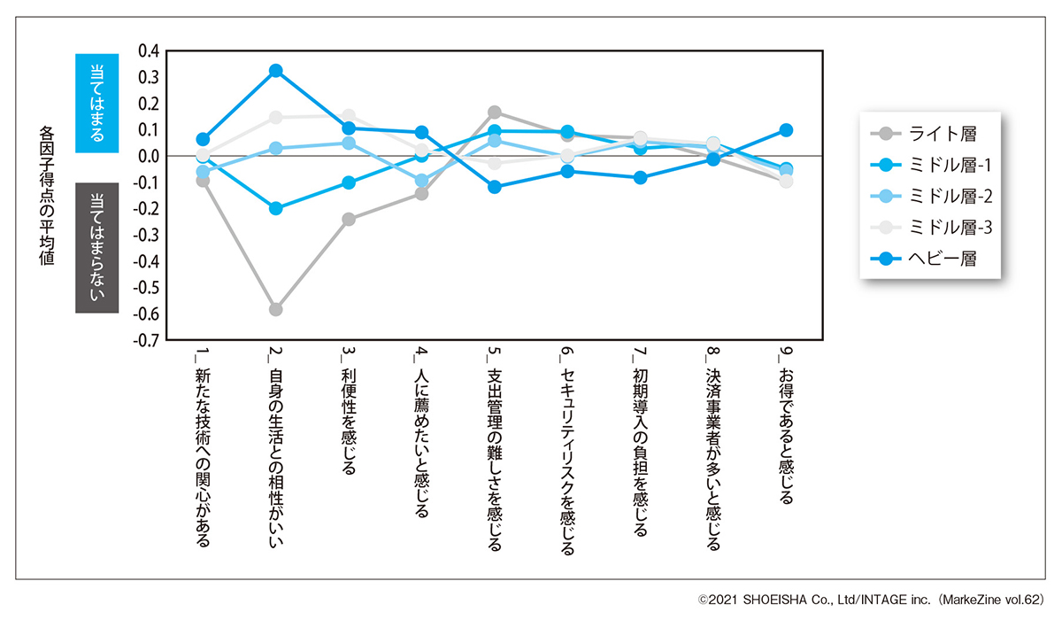 図表5の各層の波形を比較すると、ライト層とヘビー層とで対照的な動きをしていることがわかります。決済行動とキャッシュレス決済に関する意識には、一定の関係があることが言えそうです。