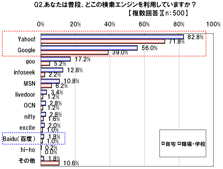 一方、2007年に日本市場に進出した百度は、自宅で1.8%、職場や学校で1.0%と、Yahoo!とGoogleの2強が席巻している日本市場の中で、健闘していると言えるのではないだろうか(参照:中国の検索エンジンBaidu、日本進出へ(IT media News))。