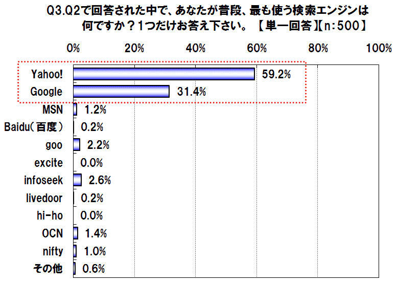 Q3では、普段「最も」利用している検索サービスについて尋ねた(単一回答)。最も利用している検索サービスは、Yahoo!が59.2%と最も多く、次いでGoogleが31.4%であることが分かった。
