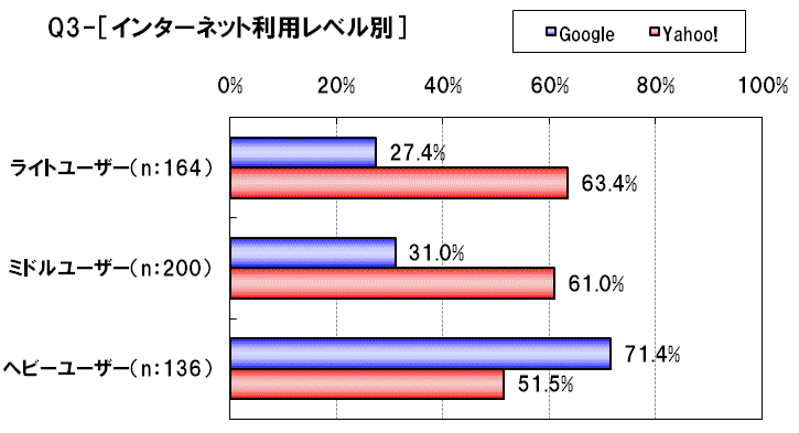 すると以下のように、ライトユーザーではYahoo!が圧倒的に多く、ヘビーユーザーではGoogleが多いとインターネット利用時間の長さによって、利用する検索サービスに顕著な違いが出た。
