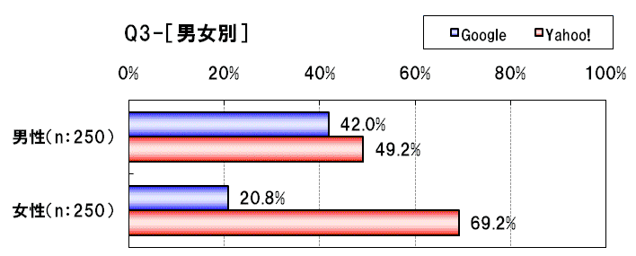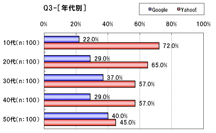 男女別や年代別でも違いが見られた。男女別でみると、男性はYahoo!が49.2%、Googleが42.0%とほぼ変わらないものの、女性ではYahoo!が69.2%、Googleが20.8%と男女で検索エンジンの利用に大きな違いがあることが分かった。年代別では、10代・20代の若年層のYahoo!利用が目立ち、年代が高まると共にGoogleのシェアが上がっていることが伺える。