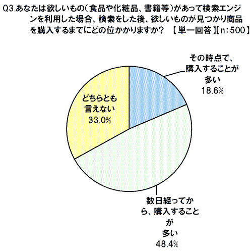 Q3では欲しいものがあり検索エンジンを利用した後、見つかった商品を購入するまでにどの位かかるか尋ねた。その結果「数日経ってから購入することが多い」が48.4%と最も多く、「その時点で購入することが多い」が18.6%になった。半数近いユーザーは、欲しい商品が見つかってもその時点では購入せず、数日経って購入していることが伺える。