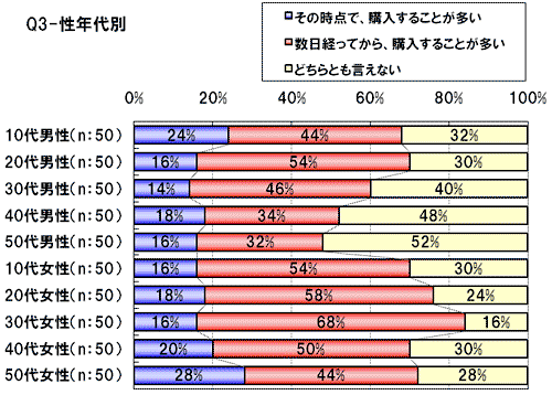 Q3を性年代別で見た場合、女性(特に10~40代)は検索をしてもすぐには購入せず、数日経ってから購入する傾向が強いことが伺える。