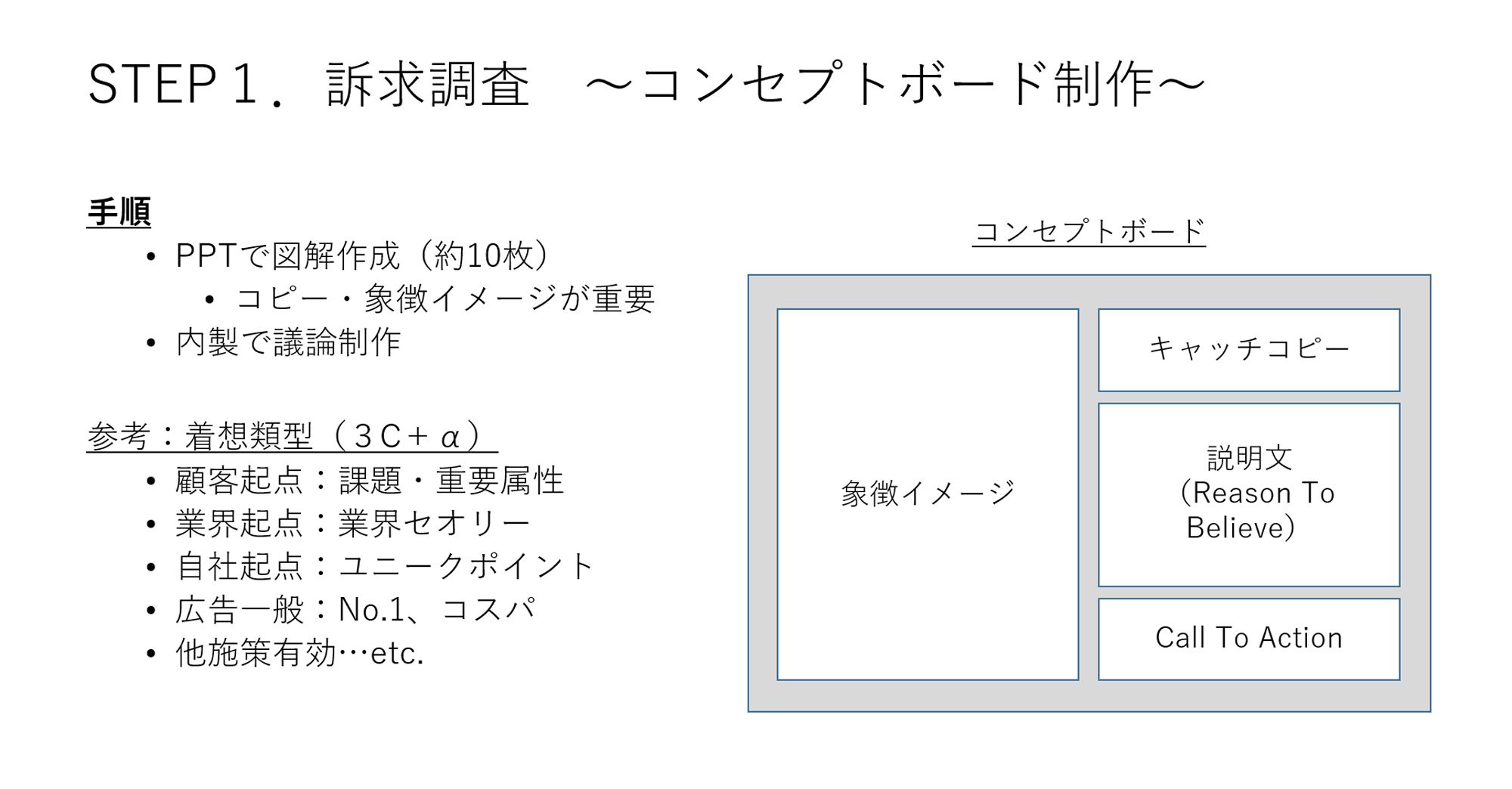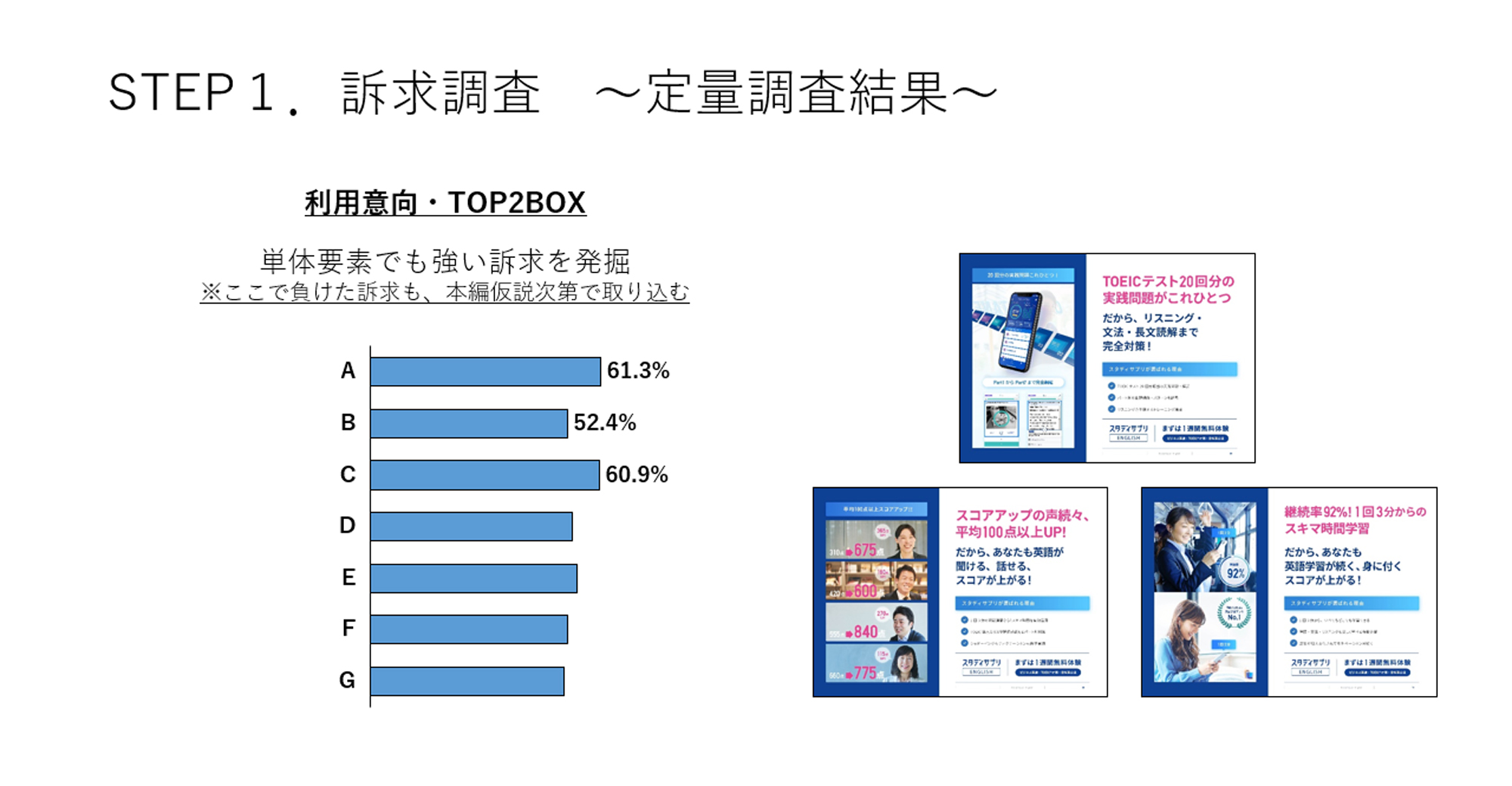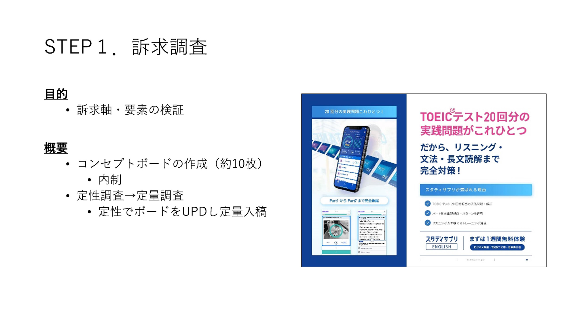 次にSTEP1. 訴求調査に移る。下図は「スタディサプリENGLISH」のテレビCM開発において実際に利用されたコンセプトボードだ。訴求調査を行う上で、まずはコンセプトボードを図解するように作成し、それを用いて定性調査と定量調査をそれぞれ行う。