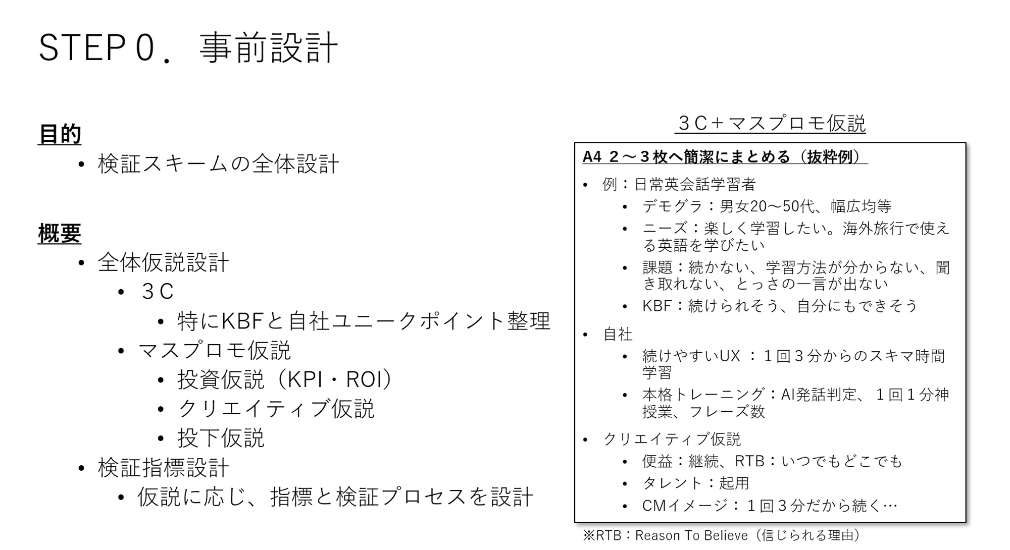 まず各STEPに入るに行うSTEP0.事前設計では、検証スキーム全体の設計を行うために3C分析とマスプロモの仮説出しを行う。その上で、仮説を検証していくための指標を設定する。3C分析を行う上で特に丁寧に整理すべきポイントは、顧客のKBF(Key Buying Factor - 購買決定要因)と自社のユニークポイントだ。