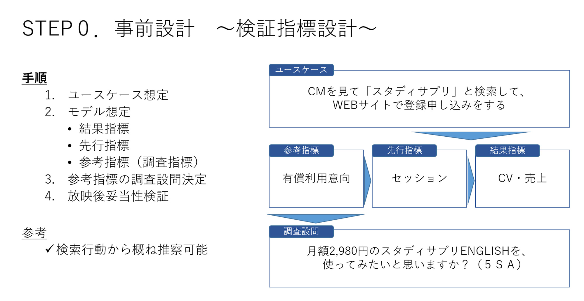 次に、上記の仮説を基に結果指標、先行指標、参考指標を設定し、事前検証の為の調査設問を設計する。テレビCMを見て「スタディサプリ」と検索して申し込みを行うケースが多いと想定した場合と、結果指標は、CVと売上が設定できる。さらに行動をさかのぼって、下図のようにセッション数を先行指標、調査での参考指標は有償利用意向を設定できる。ここまで決めることができれば、STEP1. 訴求調査へと進むことができる。