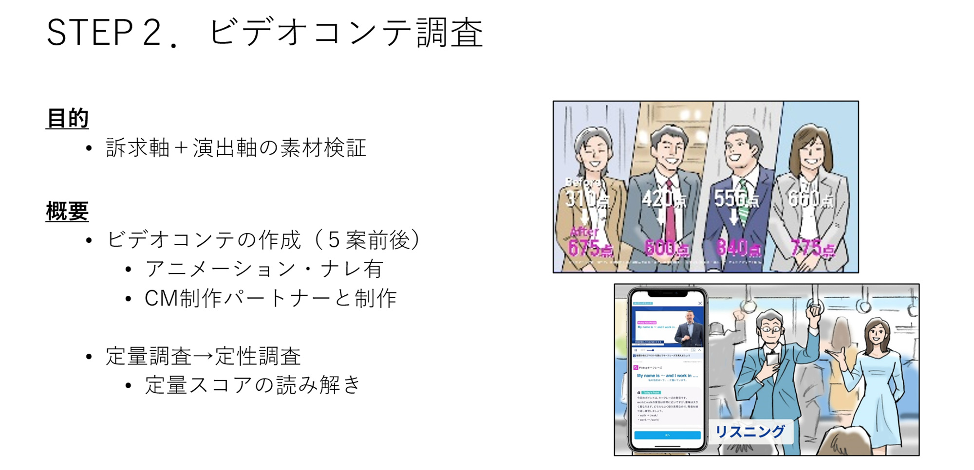 STEP2. ビデオコンテ調査では、訴求調査で見えた効果的な訴求要素を基に、5案前後のアニメーション素材を作成。それを基にコンセプトボードによる調査同様に、定性調査と定量調査を行う。このステップでは実際のテレビCMに非常に近いものを制作し、その中で良かったものを実際の撮影へと進めていく。