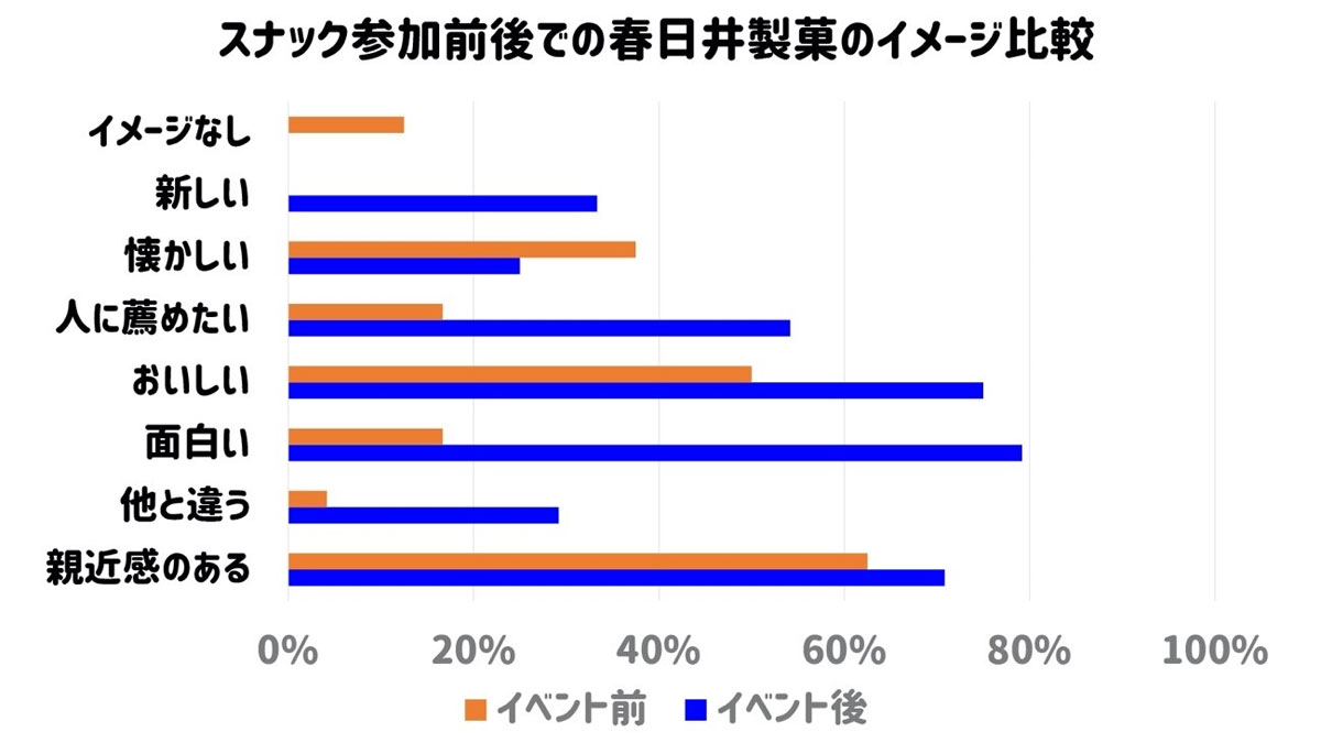 イベントの成果についての計測という点では、イベントの開始前と開始後にアンケートをとっています。下図はスナック参加前後での春日井製菓のイメージを比較したものです。