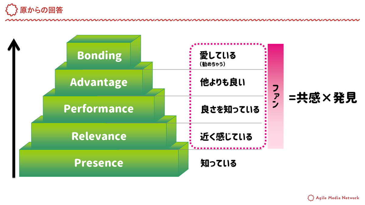 原:広告代理店勤務時代に散々使ったものに下図のような思考フレームがあり、春日井製菓では点線で囲った部分を広くファンと定義しています。下から上に段々と階段を上ってもらうために、いろんな施策を組んでいます。
