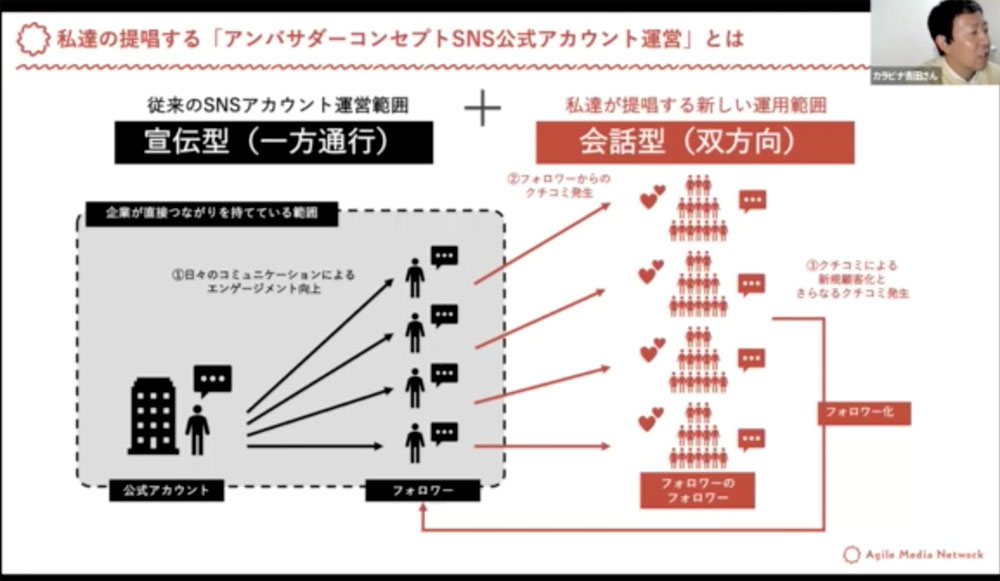 出口:これまでのメインの企業SNSアカウントが「宣伝型で一方通行型」が多かったとすると、我々とカラビナハートさんが考えているSNSは「会話型(双方向)」をよしとしています。これは、フォロワーの方に聞いてもらうというより、ユーザーに対して「好き」を作りフォロワーになり、フォロワーが段々とファンになり、ファンが最終的にはブランドや企業について発話してくれるという形を理想とするものです。
