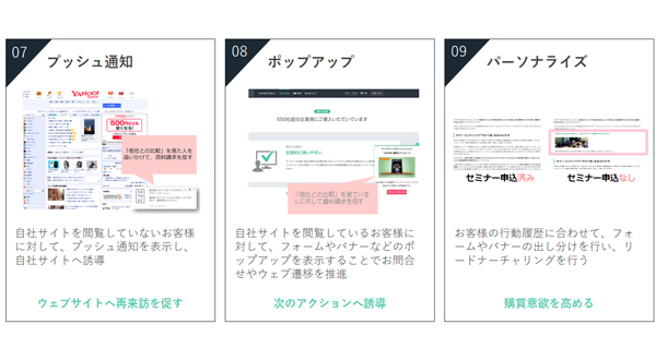 プッシュ通知は、自社のサイトを来訪した見込み顧客のブラウザに対し、任意のタイミングでメッセージを送ることができるというもの。ポップアップは、自社サイトの特定のページで特定の顧客に対して、その人に合ったメッセージを出すという機能。パーソナライズは、相手によってバナーやフォームを出し分けることができる機能だ。