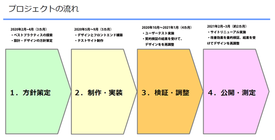 サイトリニューアルのプロジェクトは、全部で4つのフェーズ「方針策定」「制作・実装」「検証・調整」「公開・測定」に分けて、スケジュールを組みました。