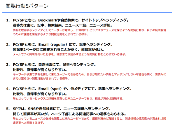 膨大な分析データから、読者の5つの閲覧行動パターンが浮かび上がってきました。そしてそれぞれの行動パターンに対するKPIを定義し、それを実現するUIを探索するために、30以上のウェブサイトのUIを要素ごとに調査し、ベストプラクティスを探していきました。そうしてやっと、リニューアル方針が言語化・可視化され、チームで共通認識をそろえることができました。