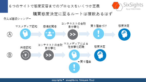 ここで、簡単な例として、マスメディア認知からのプロセスと、SNSからの共感認知からのプロセスを描いてみましょう(説明しやすくするためにあえて簡略化しています)。こうすることで、コミュニケーションデザインの全体像は作りやすくなります。
