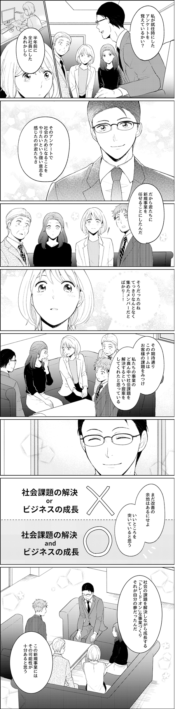 「片方を得るために、もう片方をあきらめる」という二律背反のトレード・オフの考え方ではなく、一見すると両立するのが難しそうなことを両立させて新たな価値を得ようとする考え方。従来、環境に配慮すると経済的な価値が下がるというような社会的価値と経済的価値がトレード・オフの関係として捉えられることが多かったが、今後は、社会的課題を解決しながら、ビジネスを持続可能とするような社会的価値と経済的価値が両立するトレード・オンな価値を生み出す企業戦略が必要とされる。