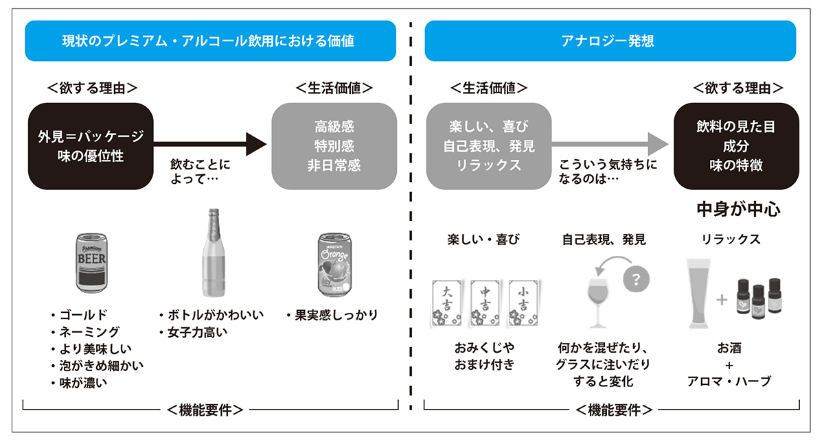 8名のインタビューの結果をもとに、現状のプレミアム・アルコールとアナロジー発想の価値の違いを分析した(図表2)。