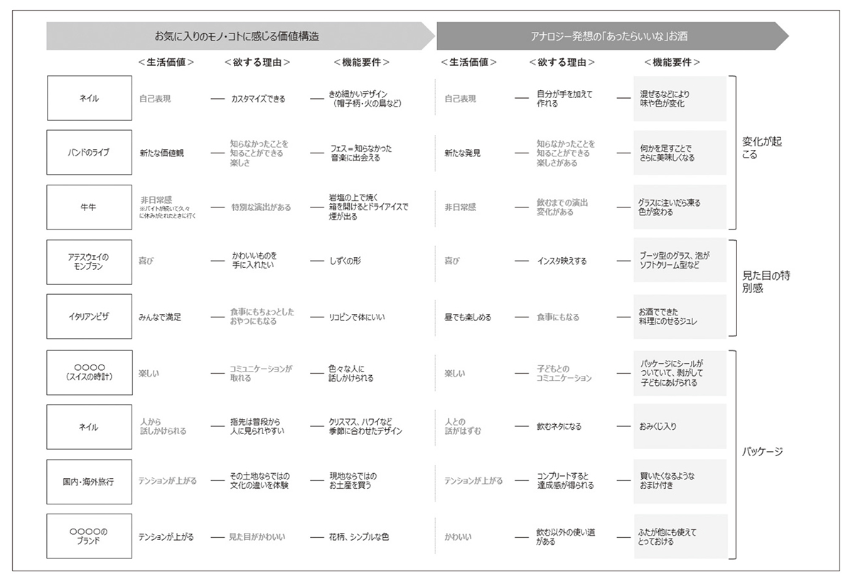 現状のプレミアム・アルコールについてのお気に入りの理由は外見=パッケージから想起されることと、味の優位性がほとんどであった。その結果、高級感や特別感につながっている。一方、アナロジー発想では、他のカテゴリーで価値と感じた「楽しい」「自己表現」「リラックス」といった上位概念から発想することが多く見られ、中身=飲料の見た目や成分、味の特徴において詳細な要素が挙がりやすかった。この比較からも、普段のアルコールを考える思考では考えにくい、アナロジーによる発想の転換により新しい視点が付与されやすくなるといえる。