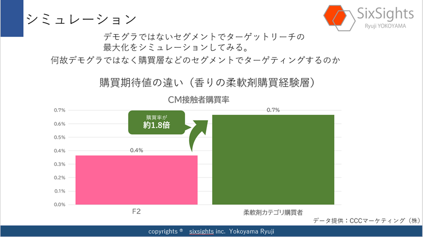 まず、デモグラではなく、購買層でのセグメントを行う理由は、購買期待値がまるで違うということにつきます。下記の図表では「香りの柔軟剤」におけるデモグラ(F2)とカテゴリー購買経験層セグメントでの購買率ですが、購買層セグメントの購買率はデモグラ(F2)の約1.8倍になります。