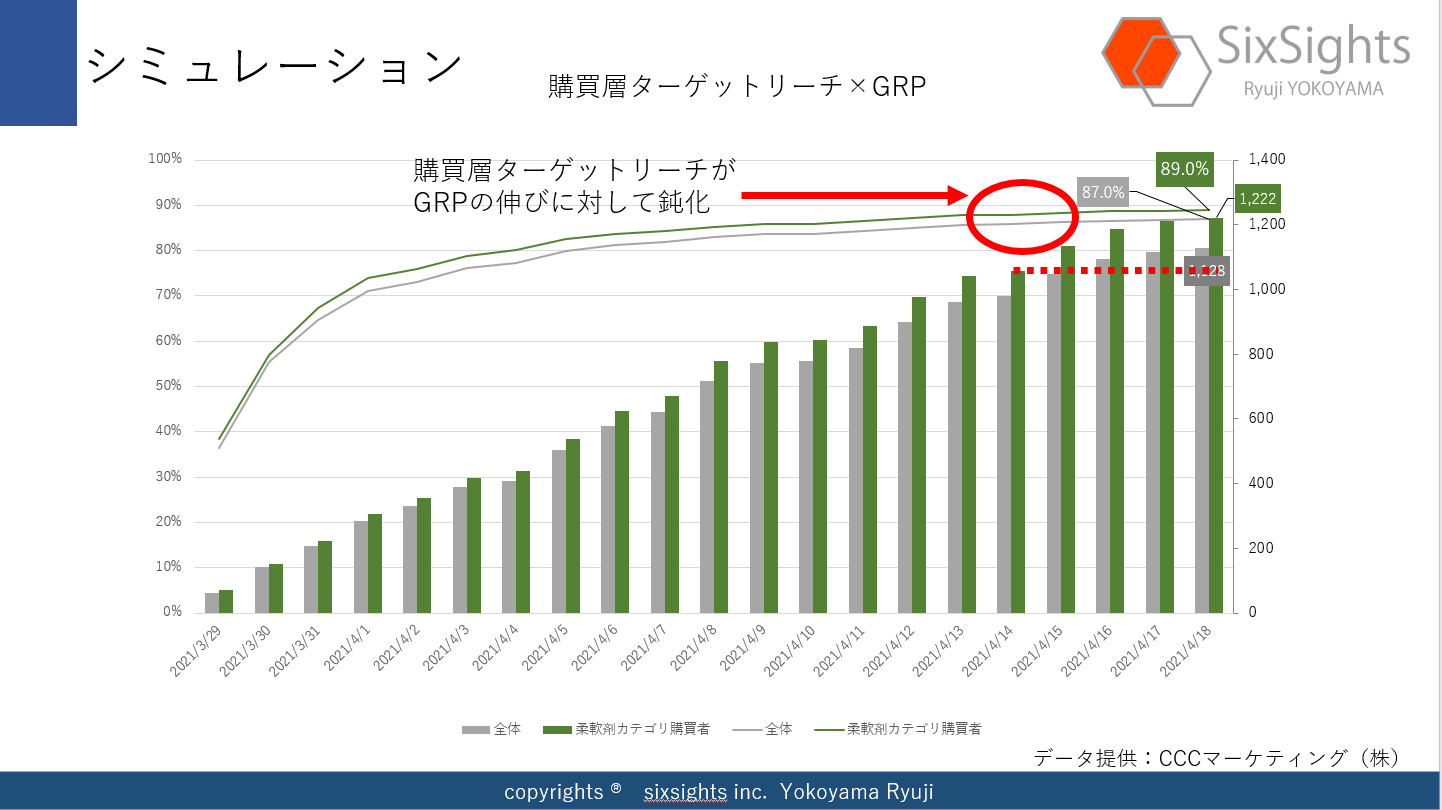 この事例では、想定1,690GRPの出稿ですが、1,580GRPでテレビ出稿を抑えて、120GRP分をデジタルのターゲティング配信に振り分けることでターゲットリーチが同じ投資額で最大化できそうです。