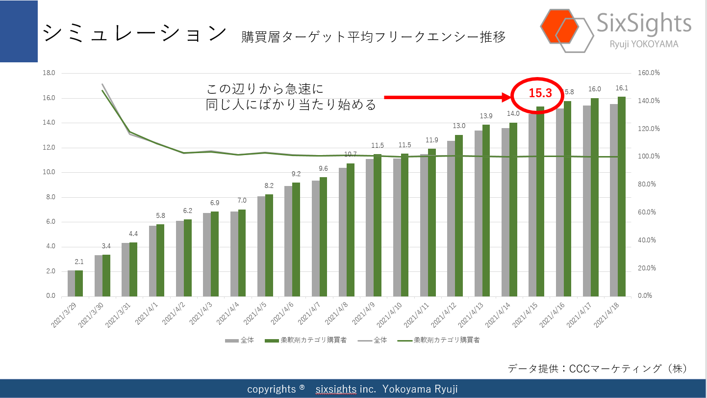 では、CCCマーケティングさんの実際のデータをお借りしてシミュレーションしたものでご説明します。テレビのターゲットリーチを補完するというと、若年層や男性などテレビ視聴時間が比較的短くリーチしにくいターゲットを事例にあげるところですが、今回は敢えてテレビCMが届きやすい「香りの柔軟剤」カテゴリーで行ってみます。
