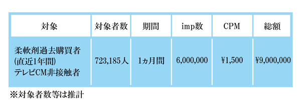 これは、この柔軟剤のカテゴリー上位商品購買経験者で当該テレビCMに非接触と思われる関東地区723,185人(推計)をターゲットに6,000,000インプレッションの動画配信を900万円を使って配信してテレビCMのターゲットリーチを補完しようというプランです。