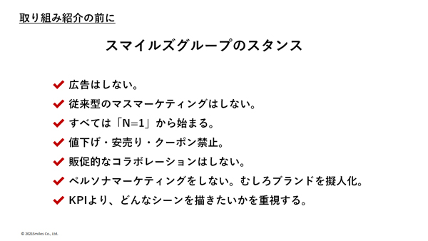 続いて、スマイルズの花摘氏も自社の事例を紹介した。まず、花摘氏はスマイルズのスタンスを以下のスライドにまとめた。