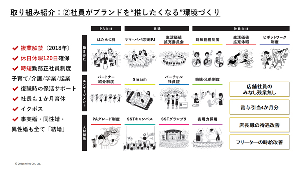 2つ目は、社員自身がファンでいてくれるための取り組み。様々な人事制度を整え、複業の許可や時短正社員精度の拡充、休日休暇の取得など様々な社員が喜ぶ仕掛けを展開してきた。
