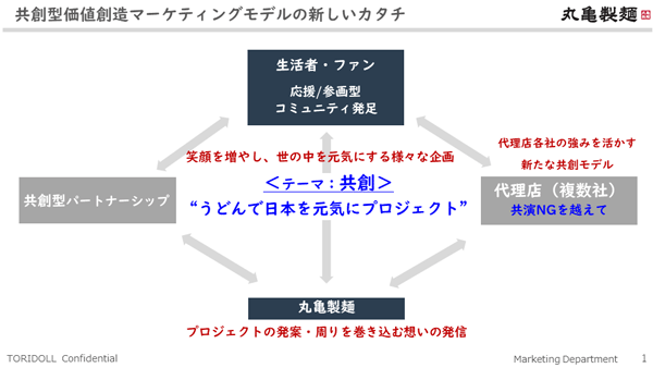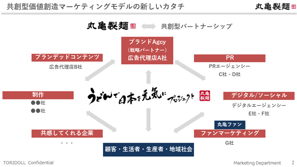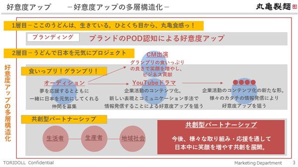 そして2層目が、今回の「うどんで日本を元気にプロジェクト」です。「食いっプリ!グランプリ!」などの消費者参加型企画や、株式会社TOKIOさんとの共創型パートナーシップはこちらに含まれます。